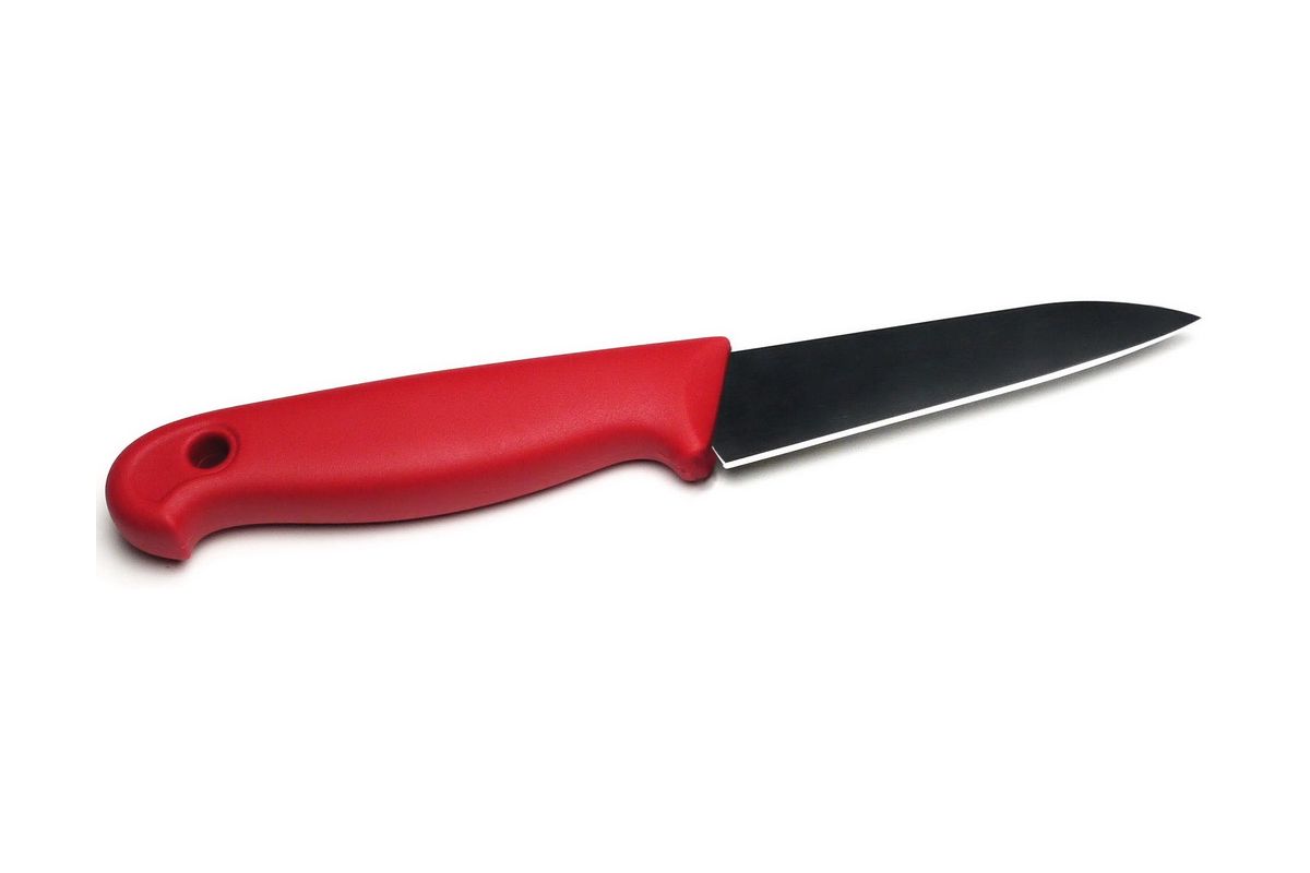 Нож кухонный универсальный с титановым покрытием покрытием PETTY 3,1''. Длина лезвия 82 мм. Молибден-ванадиевая сталь с титановым покрытием. Материал рукояти: TPE - термоэластопласт, цвет рукояти - черный, красный