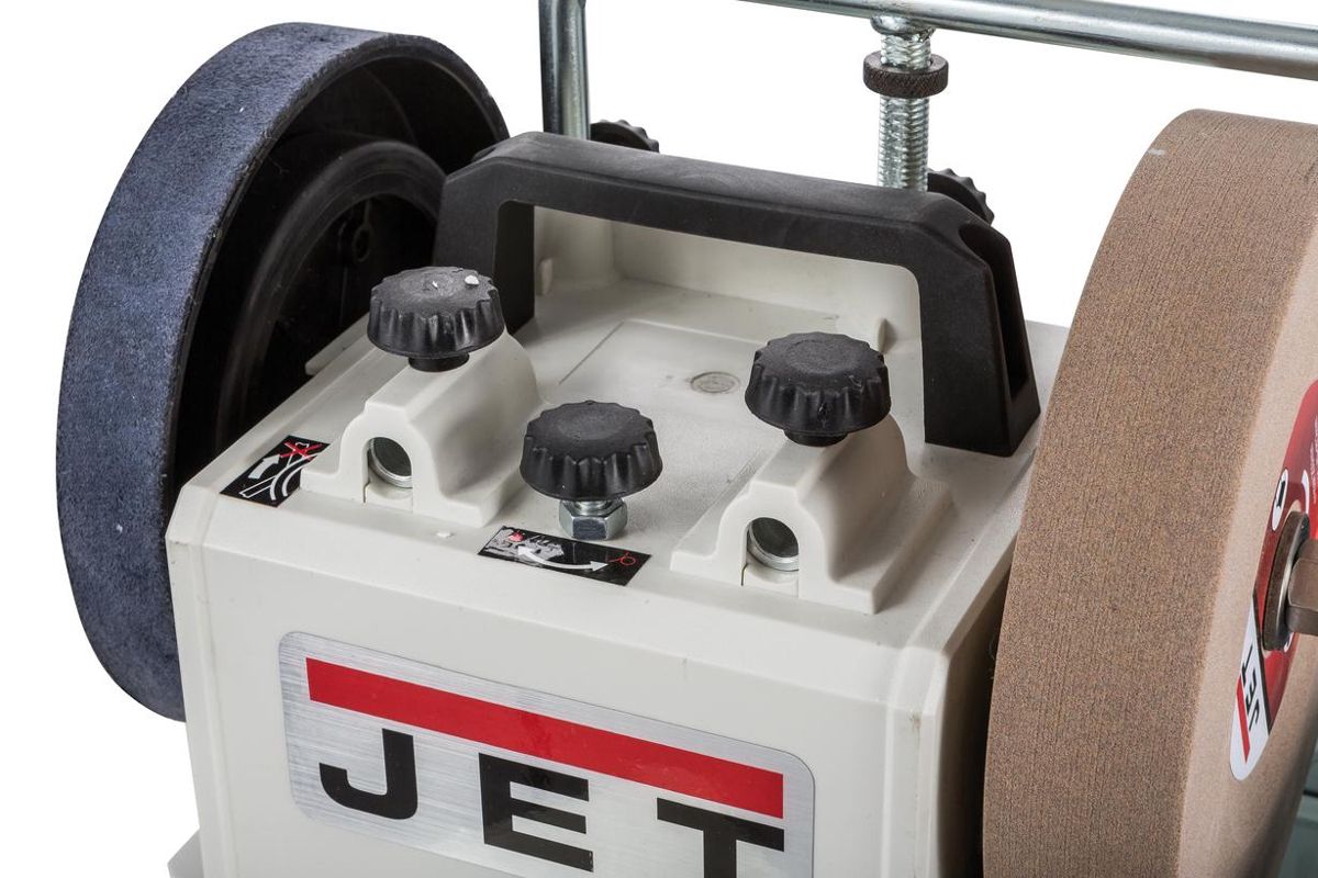 В комплект входят держатель инструмента с винтовыми зажимами и кронштейн-направляющая для работы с ним или с другими вспомогательными приспособлениями (большой ассортимент представлен под маркой JET и поставляется за дополнительную плату). В зависимости от выполняемой работы, кронштейн монтируют с одной или другой стороны корпуса, что позволяет шлифовать от кромки к обуху или наоборот. Для регулировки угла заточки его перемещают, меняя расстояние до поверхности точильного камня.