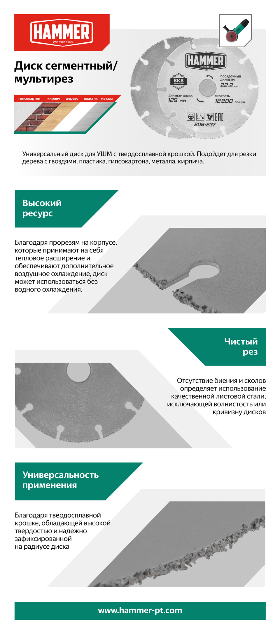 Универсальный диск для УШМ с твердосплавной крошкой отлично подойдет для резки дерева с гвоздями, пластика, гипсокартона.