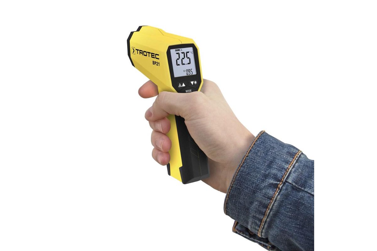Пирометр Trotec BP21 бесконтактно измеряет температуру поверхности с помощью инфракрасного датчика. Для точного определения диаметра измеряемого пятна в устройство интегрирована подключаемая двойная лазерная указка.